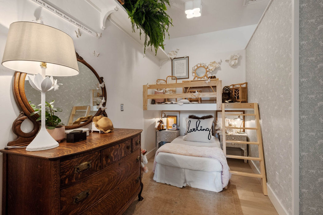 This renovation experience was one-of-a-kind as we had the chance to convert a church into a family residence. As you step inside the home, you're embraced by the bright and airy atmosphere with an abundance of natural light streaming through the large windows. The interior design of this remarkable space strikes a perfect balance between modern minimalism and striking visual elements. The white walls and light furnishings and cabinetry created a clean and crisp canvas, allowing the unique antique decor selections to shine. Bold wallpaper prints from blue florals to moody green grasscloth wall coverings adorn select walls, infusing the space with personality and intrigue. With two office spaces providing dedicated areas for productivity and focus, ample space in the great room to entertain and play, this fully renovated home provided such a versatile space for the family to enjoy.